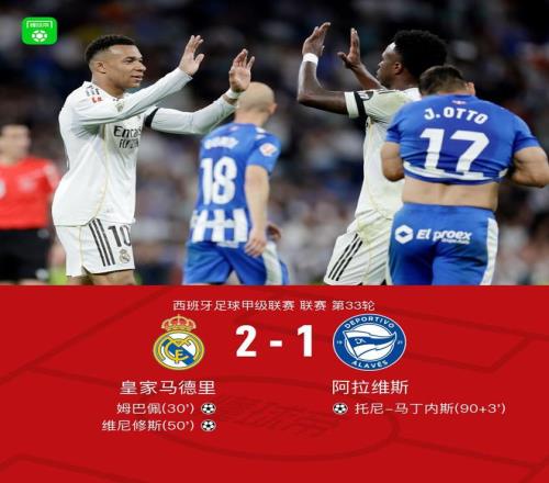 北京时间4月22日西班牙足球甲级联赛第33轮,皇家马德里主场对阵阿拉维斯。上半场,姆巴佩射门折射入网。米利唐射门击中横梁,不过巴西人也在这次射门中受伤被替换下场。下半场,维尼修斯轰入世界波。补时阶段,托尼-马丁内斯破门。全场比赛结束,皇马2-1战胜阿拉维斯。
